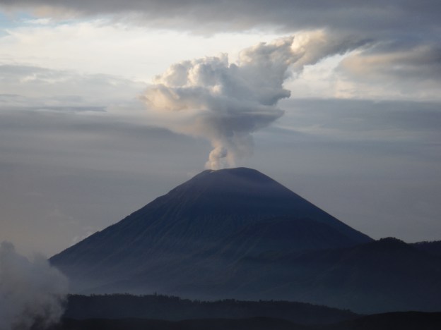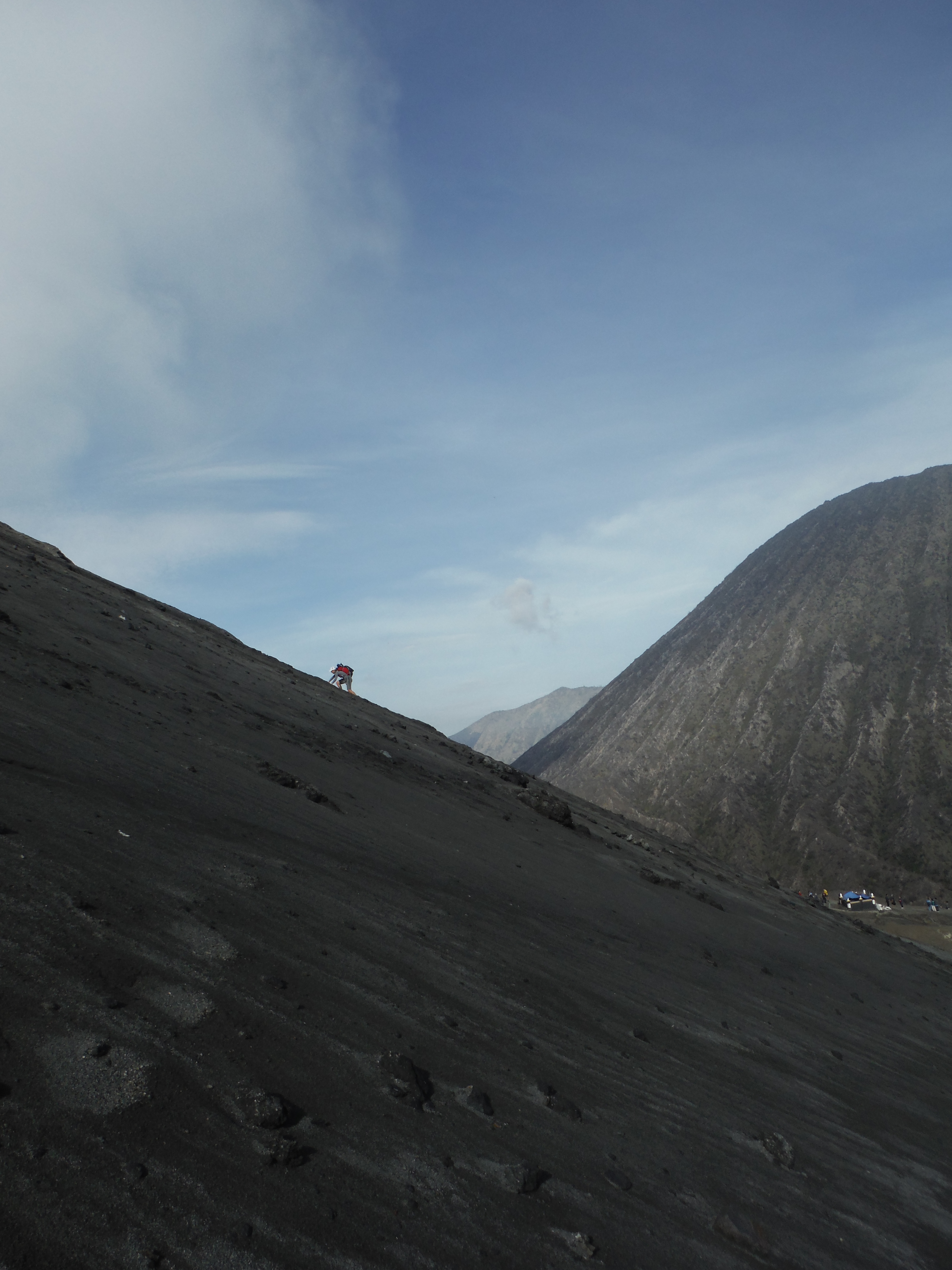 To our surprise, the day did get better though. We drove down a different path of winding roads and ended up at the base of Mount Bromo. Our guide suddenly stopped the jeep, pointed to the mountain, and said, “Walk, 1 hour”. So we did as we were told and wandered to the mountain and started strolling. There was a set of stairs but it was full of tourists so we went to the secluded side of the mountain and climbed up the black volcanic sand. We weren’t sure what would be at the top but to our astonishment there was a ledge about 2 meters wide and then a plummeting drop down into a smoking crater. It was a beautiful phenomenon; we were standing on the edge of a smoking volcano!